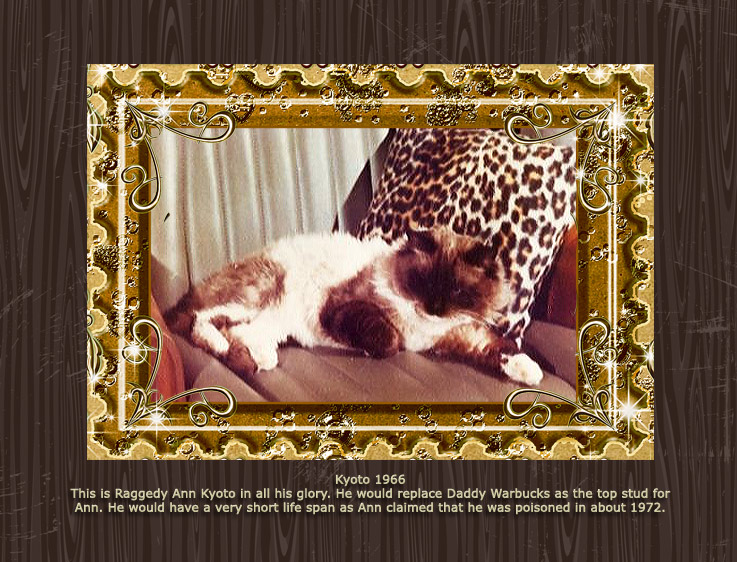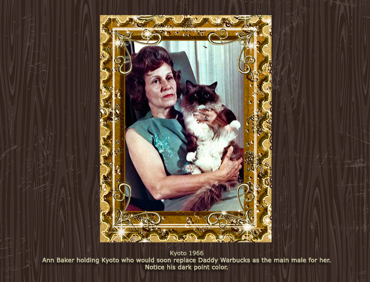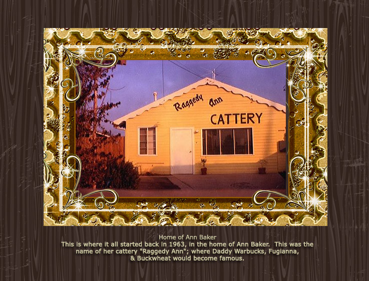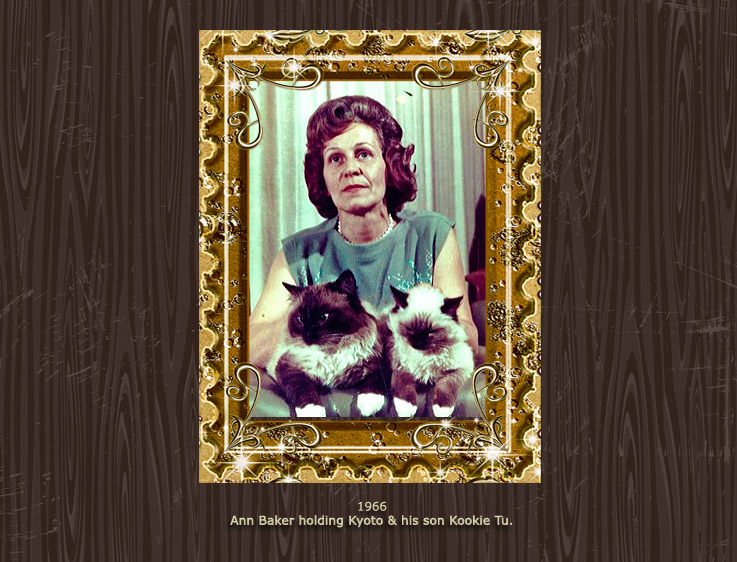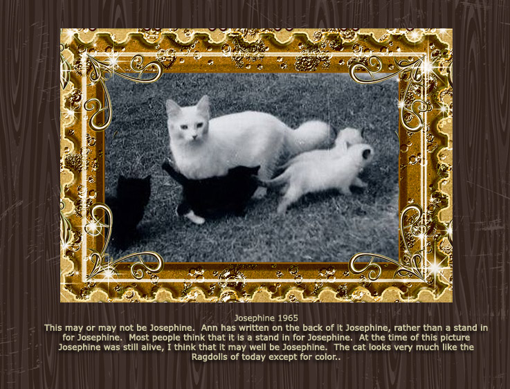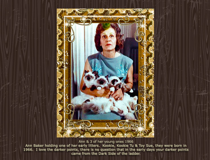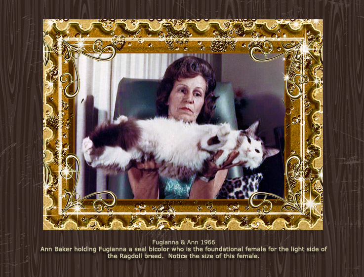 Raggedy Ann was the cattery name used by Ann Baker, creator of the Ragdoll breed. The photos below show Ann along with a number of her cats. Most of these photos were taken in the 1960s and 70s.